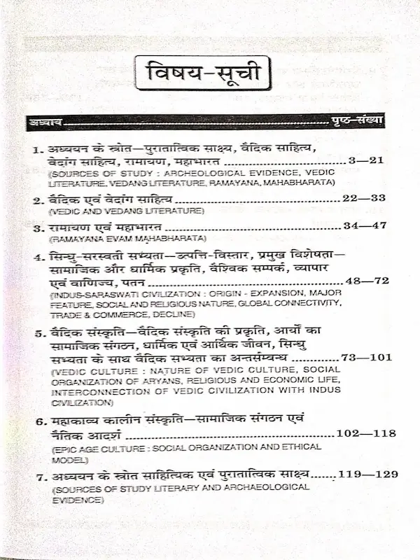 • Adhyayan ke srot jaise puratatvik saboot, vedic sahitya, Ramayan aur Mahabharat ka vivechan kiya gaya hai