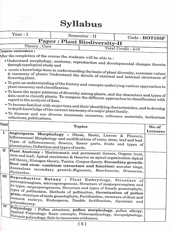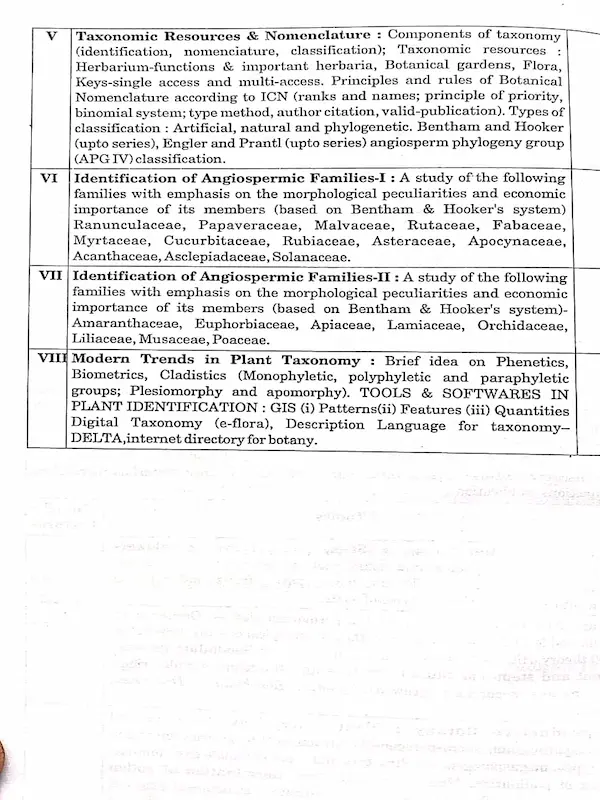 The content covers plant morphology and modifications, plant tissues and anatomy, reproductive structures of plants, pollination, fertilization, pollen morphology and applied palynology. It also includes classification systems, herbarium and botanical garden studies, taxonomic keys and identification of major angiosperm families based on Bentham and Hooker classification system.